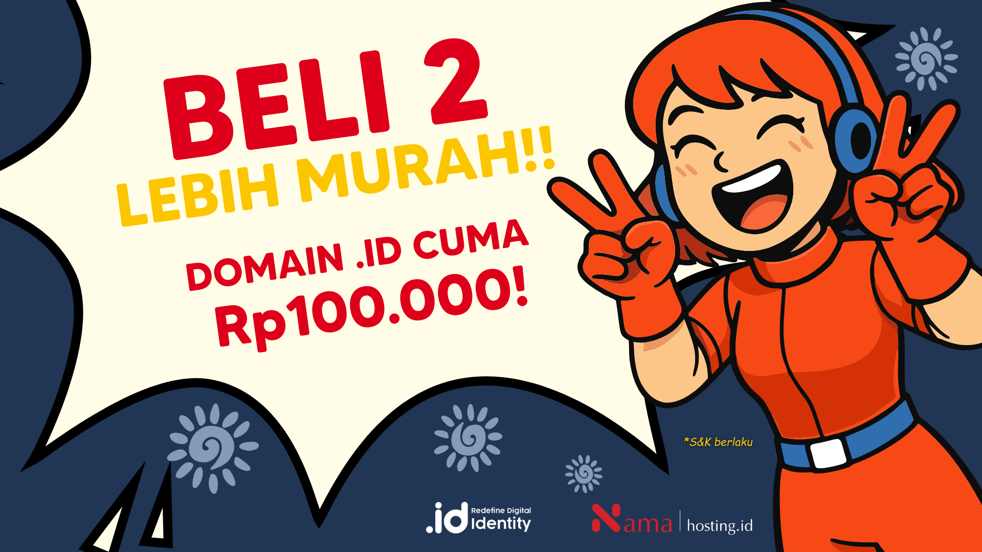 Khusus setiap pembelian domain internasional, kini kamu bisa beli domain .id seharga Rp297.297 Rp100.000.